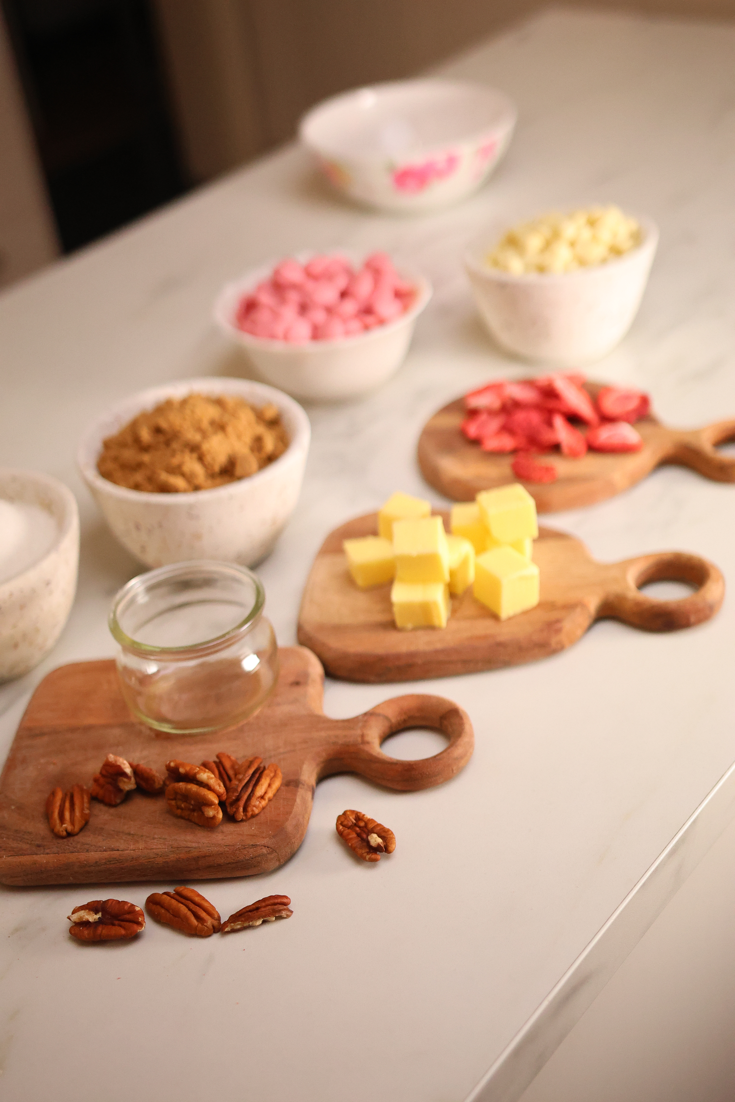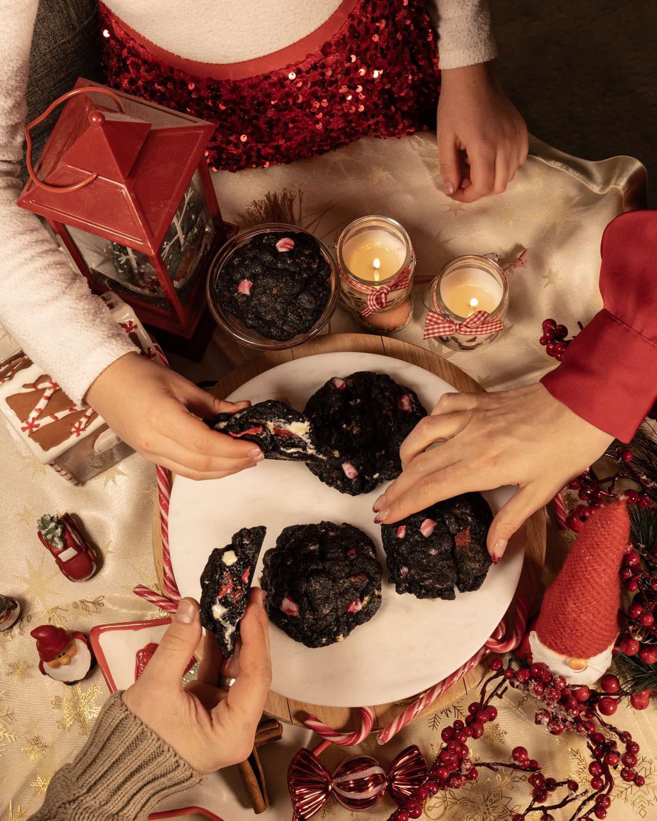 Vetemjöl, vita chokladbitar, socker, farinsocker, smör, ägg, svart kakaopulver, bakpulver, mint, polkagrisklubbor och salt.